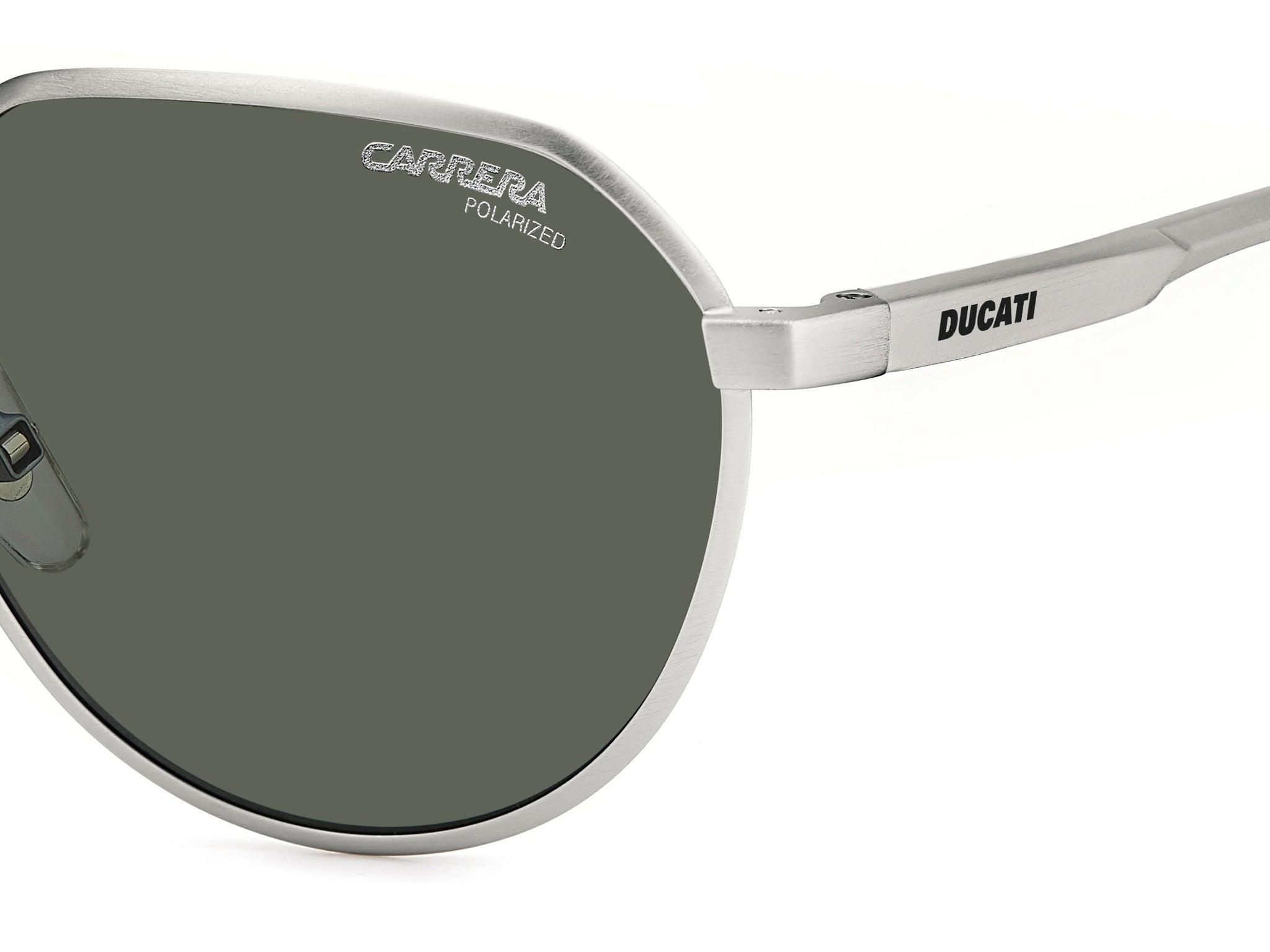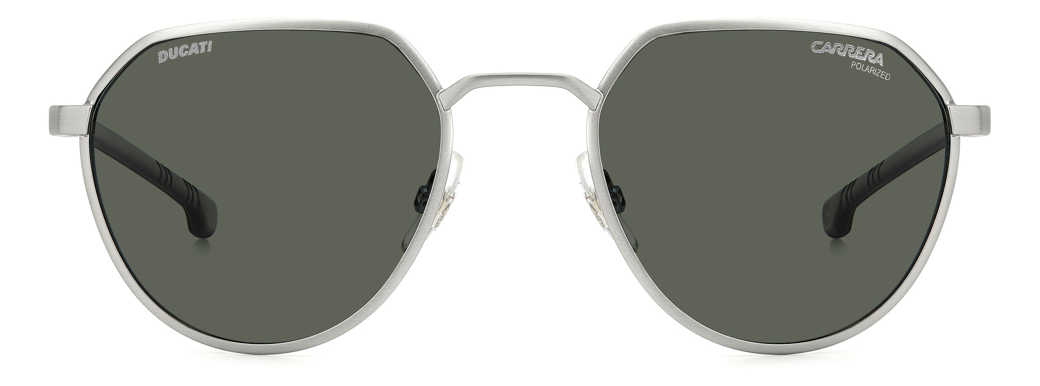 Impeccable sporty style defines these Carrera | Ducati sunglasses. The exquisitely geometric and modern pantos shape of the front will flatter both male and female faces, and the frames can hold prescription lenses. The aluminium temples have flexible hinges and shiny rubber end tips, for a perfect fit under a motorcycle helmet. These glasses also come in a brushed aluminium version, a direct ode to the world of motorcycles, and with mirrored or polarized lenses.