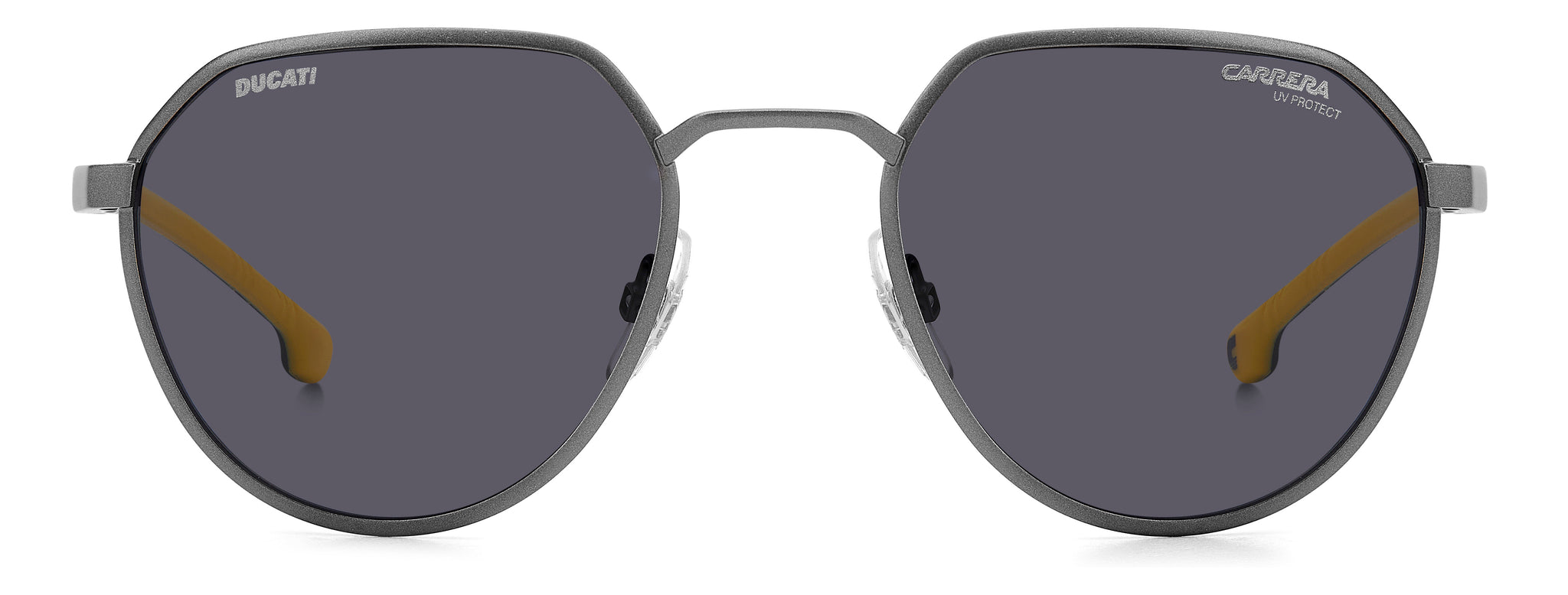 Impeccable sporty style defines these Carrera | Ducati sunglasses. The exquisitely geometric and modern pantos shape of the front will flatter both male and female faces, and the frames can hold prescription lenses. The aluminium temples have flexible hinges and shiny rubber end tips, for a perfect fit under a motorcycle helmet. These glasses also come in a brushed aluminium version, a direct ode to the world of motorcycles, and with mirrored or polarized lenses.