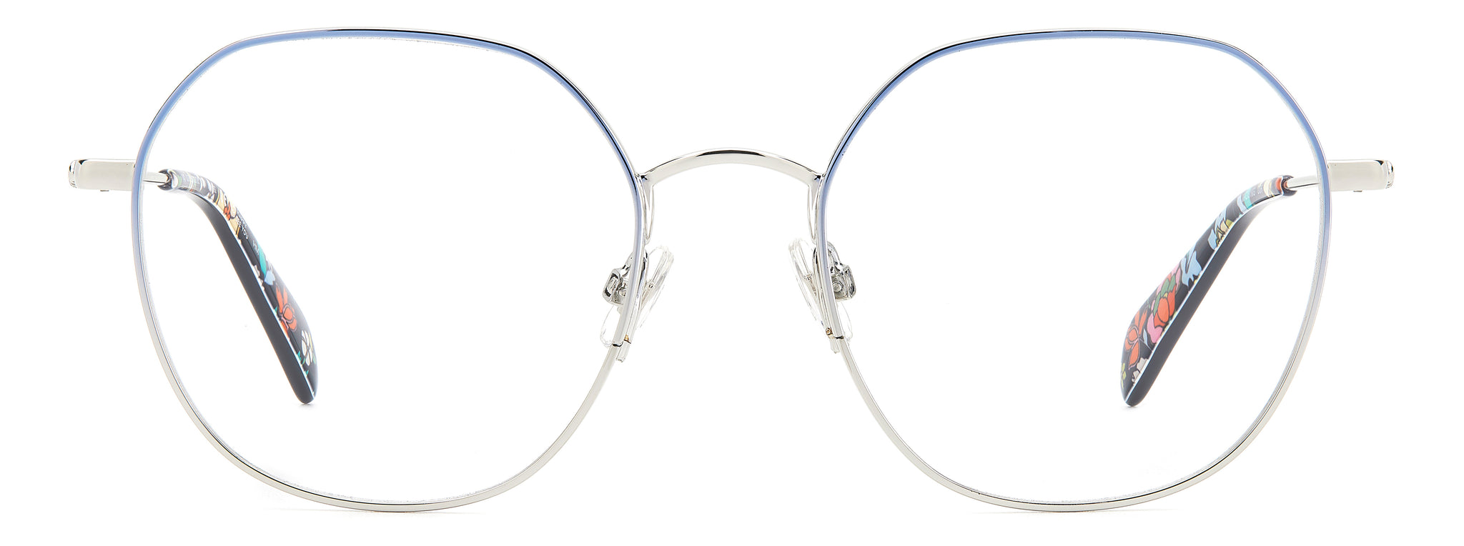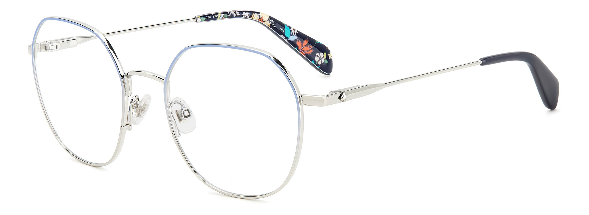In metal with acetate end tips, the mix of hues, patterns and shading used on these KATE SPADE eyeglasses is striking. The color palette, the KATE SPADE logo, and the SO HAPPY TO SEE YOU inscription on the inside of one temple make this style undeniably unique.