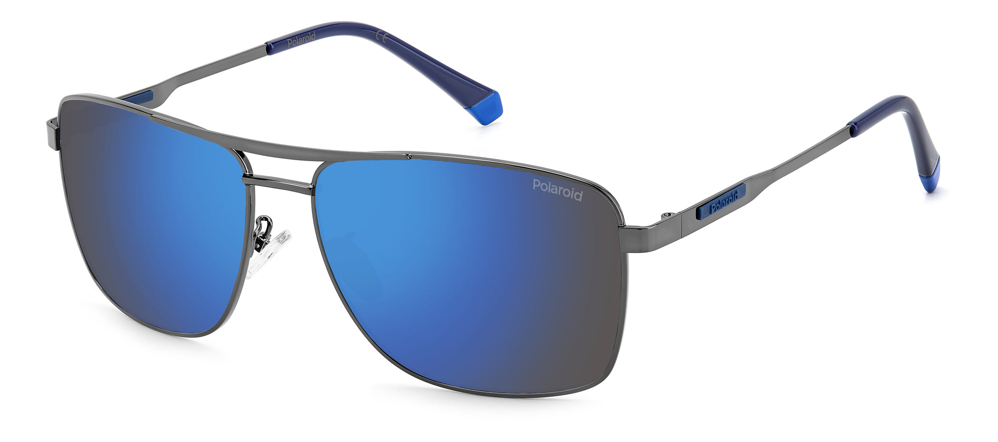 These airy, lightweight sunglasses hint at a dynamic, wrap-around shape, designed by Polaroid while drawing inspiration from the world of sport to create an item perfect for everyday use. The sinuous lines of the double-bridge frame front are accompanied by the slightly bolder shape of the temples. The adjustable nose pads ensure these sunglasses adapt to all faces. The rubber logo plaque on the temples near the hinge and the detail on the end tips are in a contrast hue.