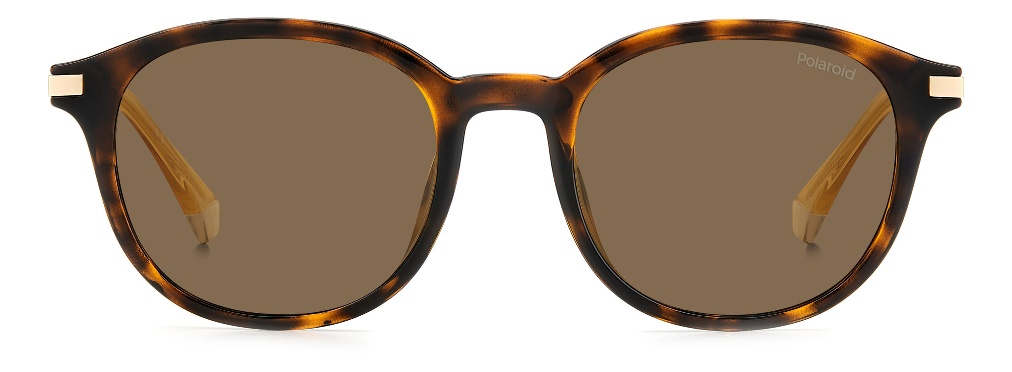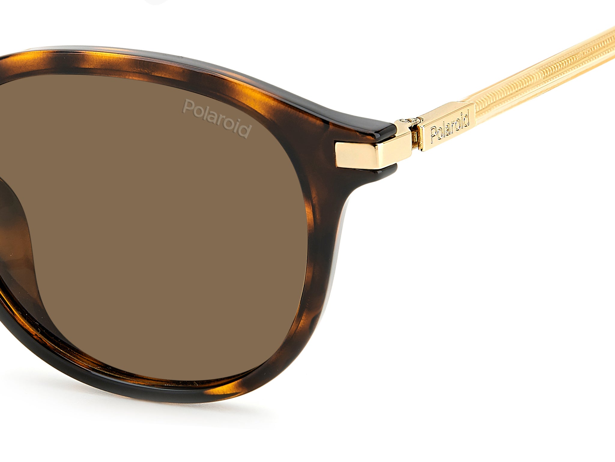 These unisex Polaroid sunglasses have a polycarbonate frame with a transparent coating on the temples, leaving the metal core visible. The rounded front can be fitted with prescription lenses, and the temples are customised with iconic contrast-coloured tips.
