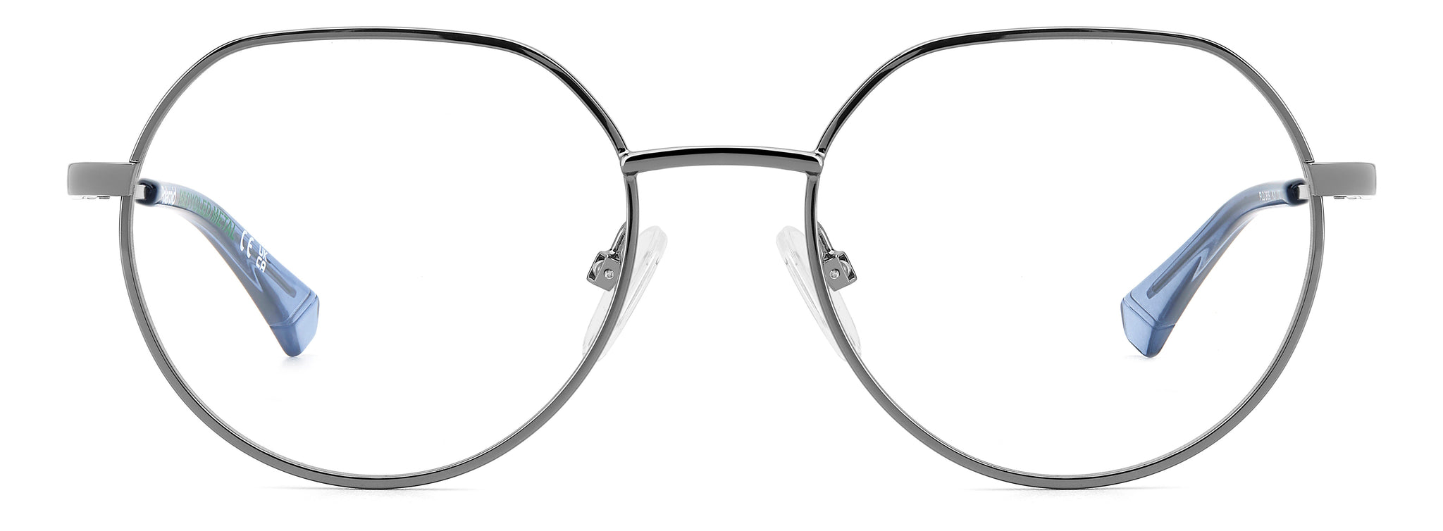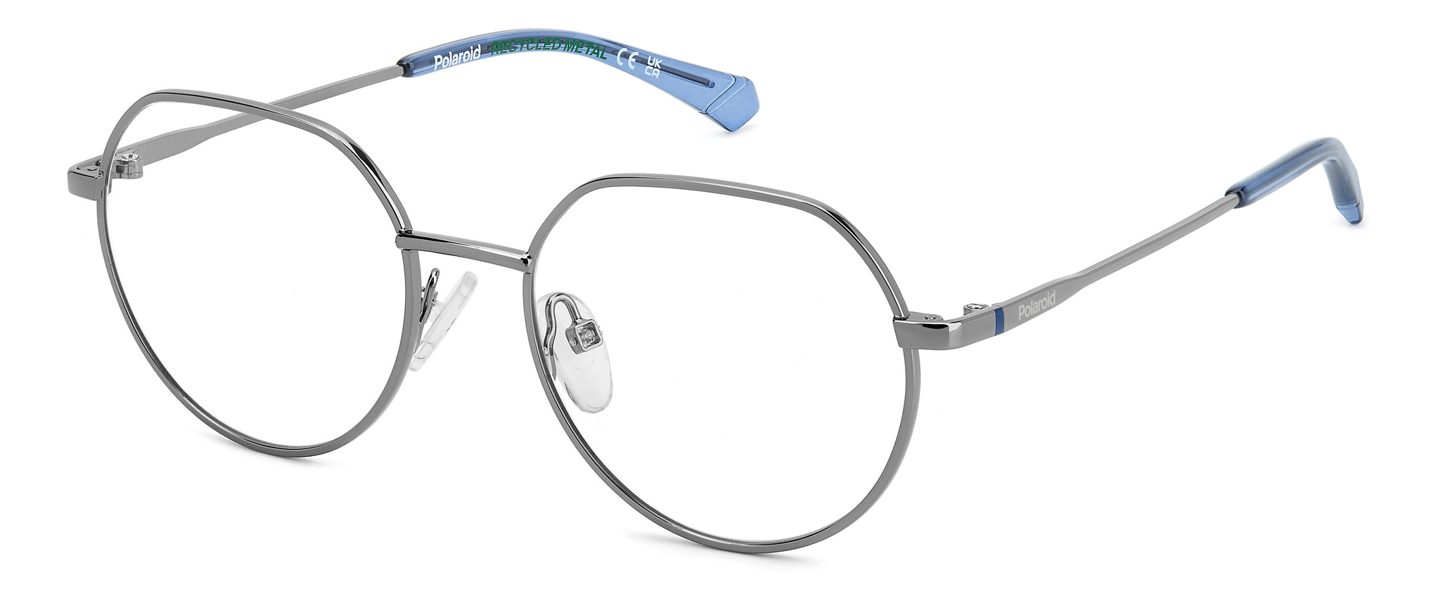 Rounded rims and slender lines define these optical glasses for boys and girls ages 7 to 10. They're made of stainless steel and another type of metal, both recycled for reduced environmental impact. The comfortable adjustable nose pads, the tonal end tips, and the fine laser-engraved Polaroid logo on the temples complete the accessory. Available with an enamel-coated front for an additional touch of colour.