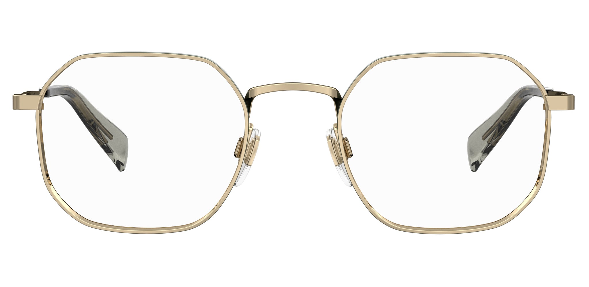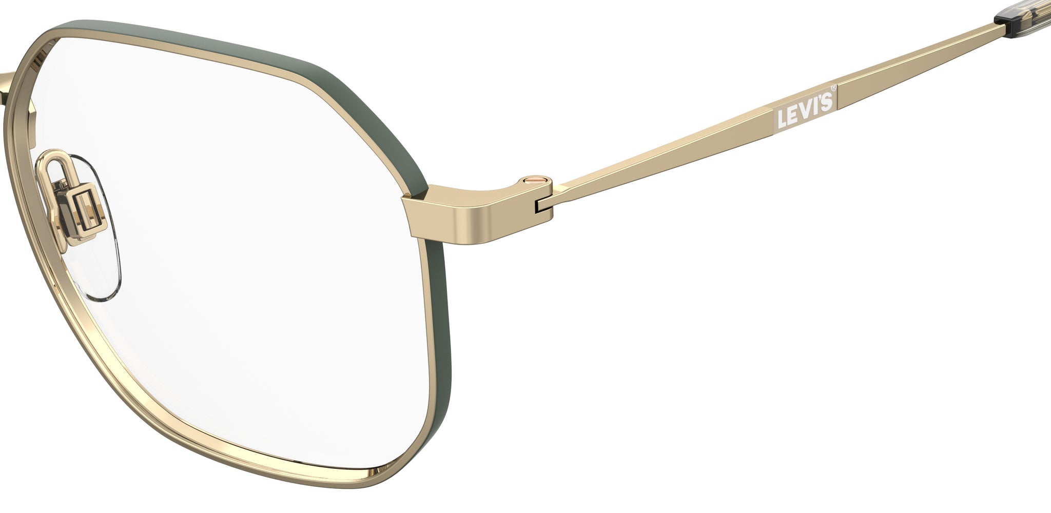 These unisex eyeglasses by Levi’s® guarantee clean, essential style. The stainless steel structure is completed by a geometric front that rests on practical nose pads, also offered in a two-tone version. Take note of the flat temples that extend into clear or contrast end tips, trimmed by a red or tone-on-tone enamel logo.