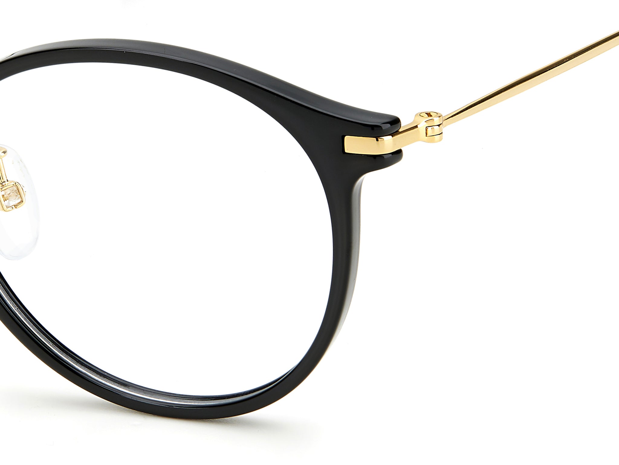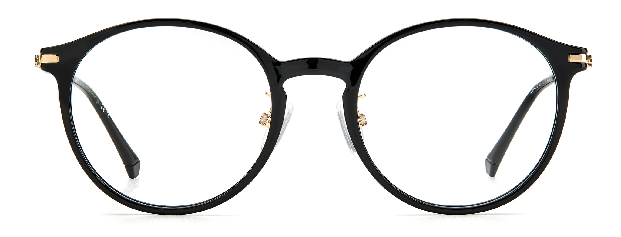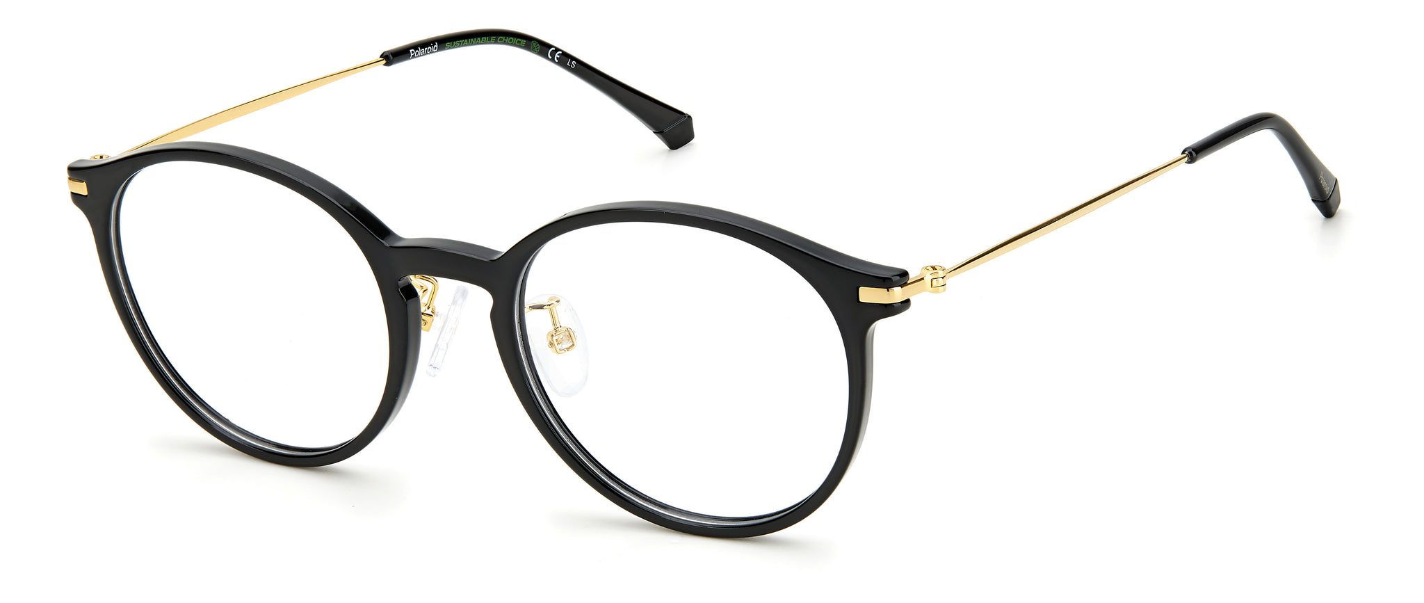 These Polaroid eyeglasses were designed for women who see the world from a fresh perspective. The pantos shape naturally fits just about all facial features, and the frame is made of bio-based plastic, a material partially derived from renewable resources. The stylish black hue is echoed on the ends. Adjustable nose pads and slim golden metal temples ensure comfort and a barely-there feel.