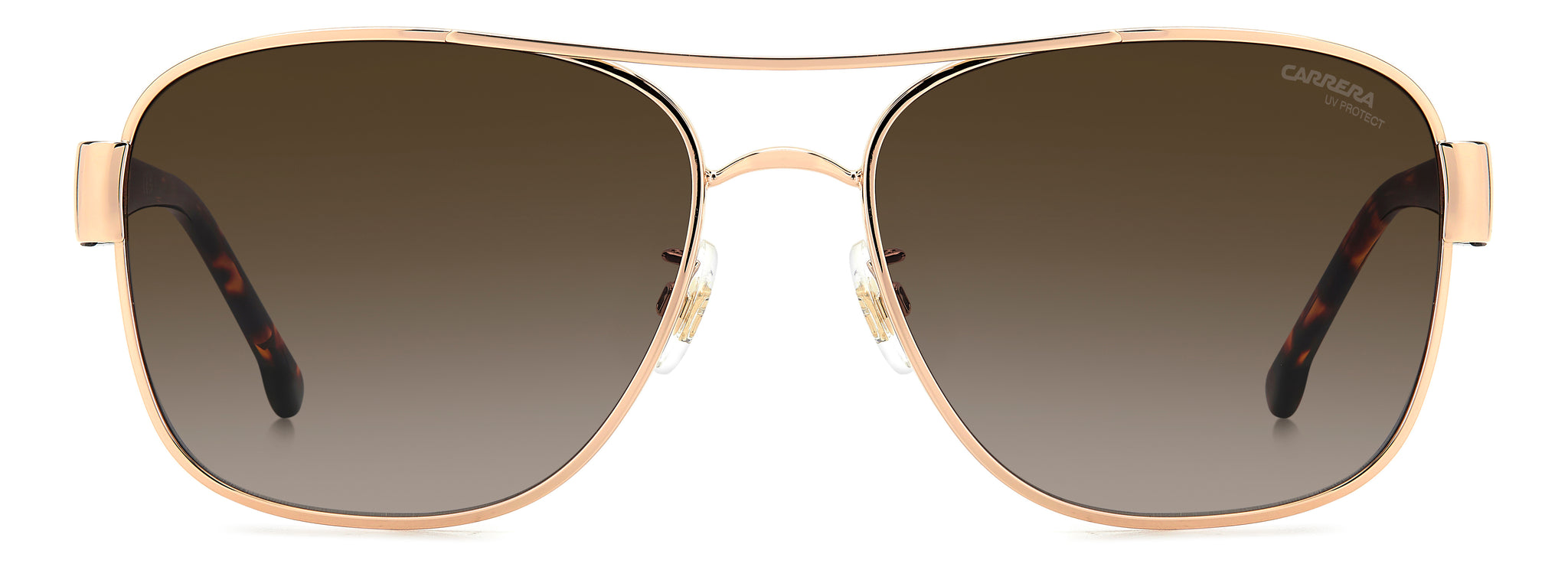 These Carrera women's sunglasses instantly bring incomparable style to any ensemble. The eyes are protected by the full-coverage front, with rims in different tones of gold united by a double bridge. A style to wear well beyond the sunniest hours of the day, especially when fitted with prescription lenses, these frames are extra stable thanks to adjustable nose pads. They also come in a version with multi-layer temples, or with polarized lenses.
