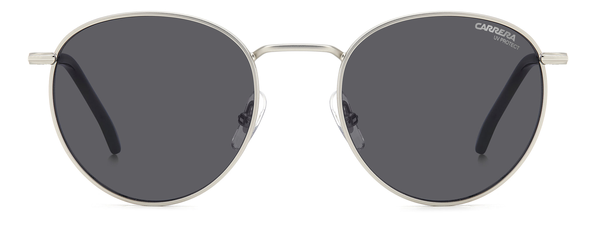 Carrera has expanded its eyewear collection with these pantos sunglasses, here in metal. Known for looking good on just about everyone, this shape is loved for being versatile and timeless. The outer profile of the stainless-steel front is finely grooved to echo the Carrera flag, while the hinges are concealed behind a detail in the form of the famous Carrera “C”. The slender temples are also in metal, trimmed by a laser-etched logo, and one version extends into multi-layer temples. This style can hold prescription lenses.