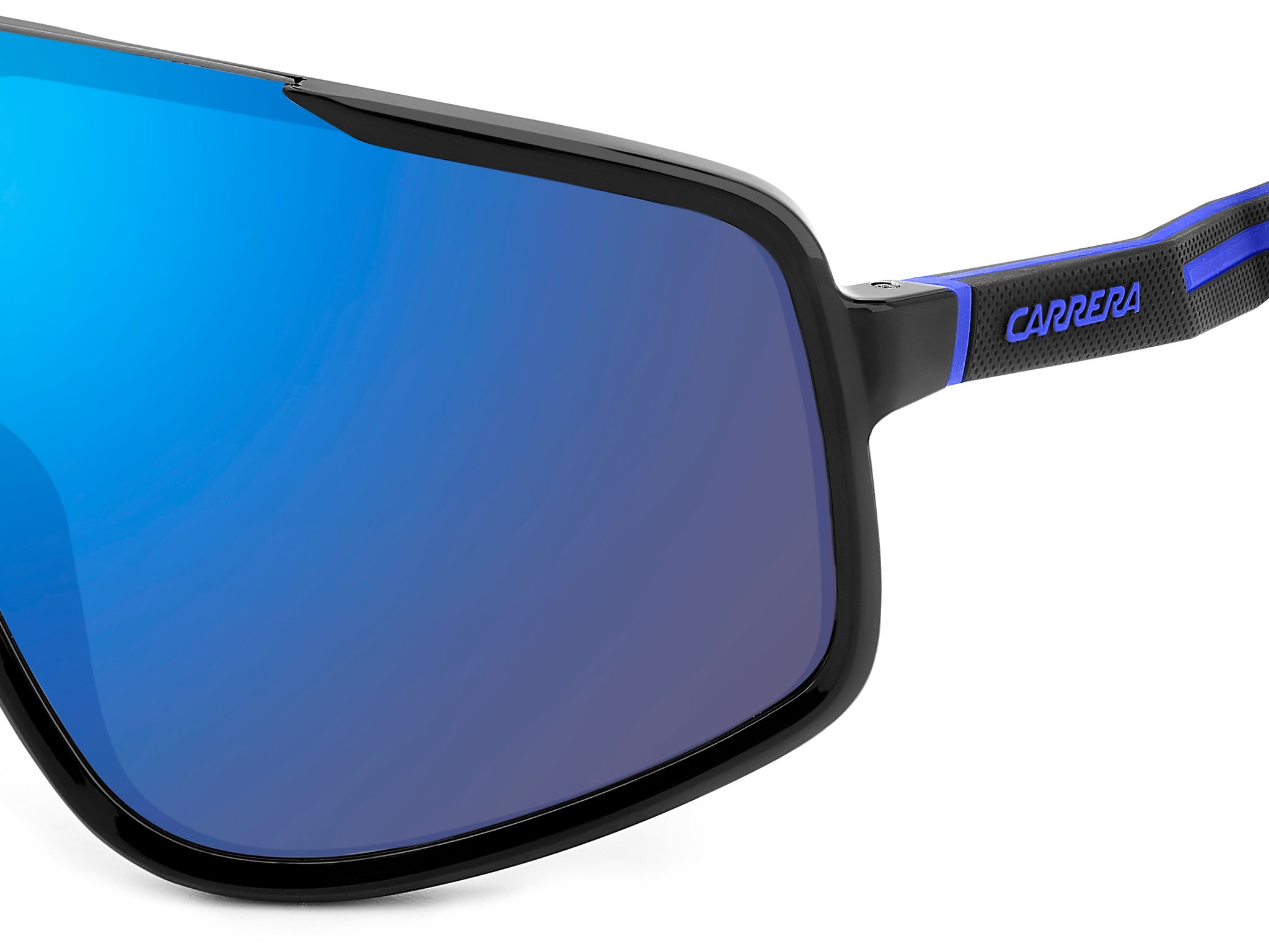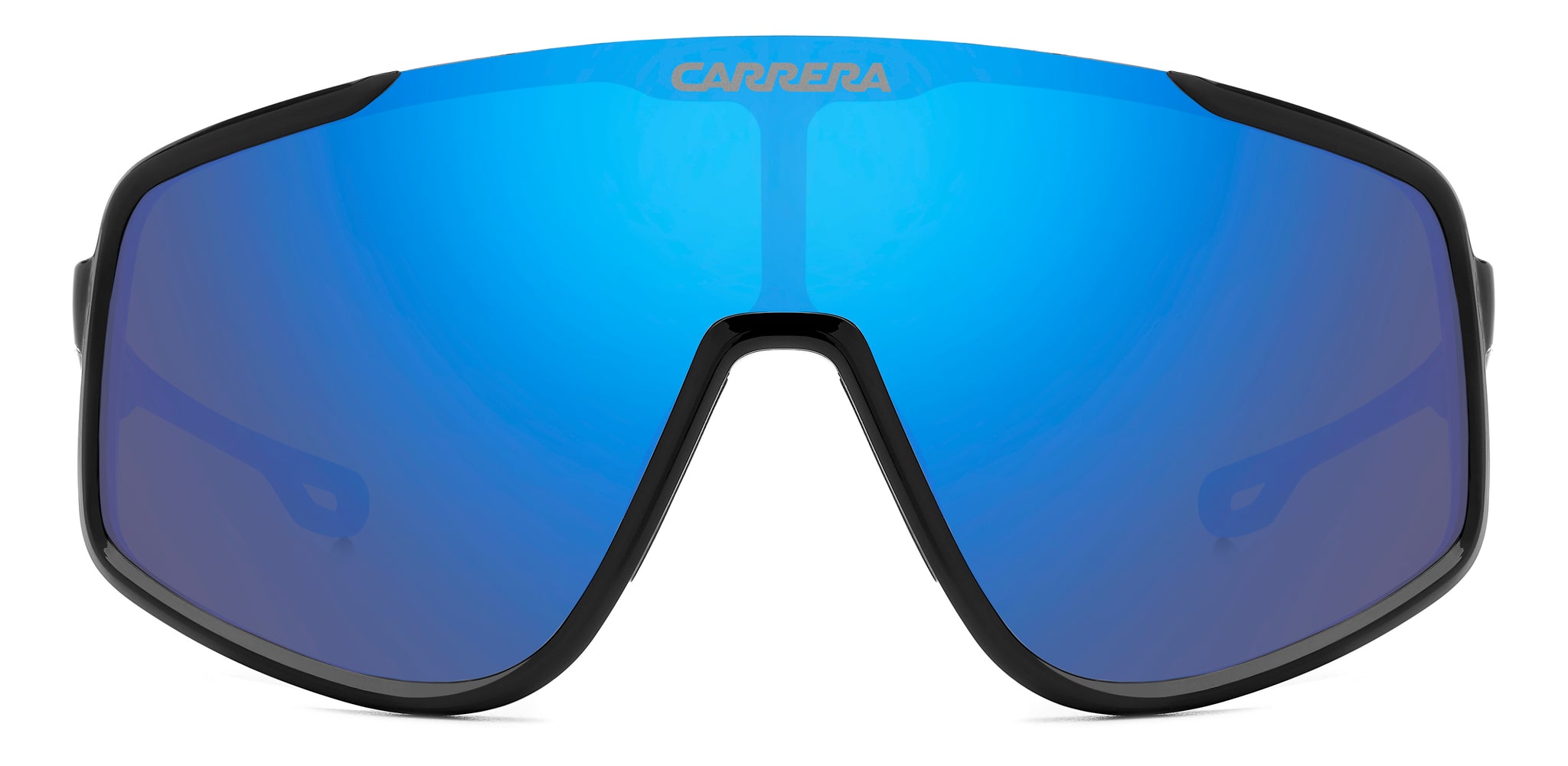 These Carrera sunglasses are sporty and high-performance. The maxi shield lens is captivating, whether standard or mirrored, and is held in place by a single frame that is open along the top. The two-tone temples are equally alluring, with a slightly folded shape. They're injection-moulded in two materials and colours, with rubber inserts that create the famous Carrera flag. The holes on the end tips were inspired by active lifestyles, while the Carrera logo ensures a place in the fashion limelight.